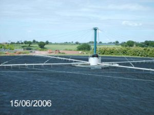 The Tuke & Bell Carlton distributor consists of a static central column with a rotating galvanised steel tank. Either two or four distributing arms are fitted to the tank and these are supported by vertical wire ropes or solid rods attached to the top bearing head. The Carlton features a liquid seal arrangement that retains the machine prime without the need for maintenance intensive gland packing. Motive rotation force is provided by jet reaction from the arms. The distribution arms can feature EPDM “Pop-In” jets or low maintenance upward flow weir boxes if the machine is to be motorised.