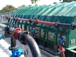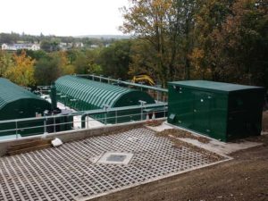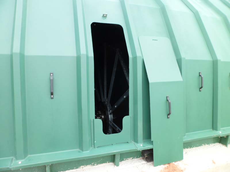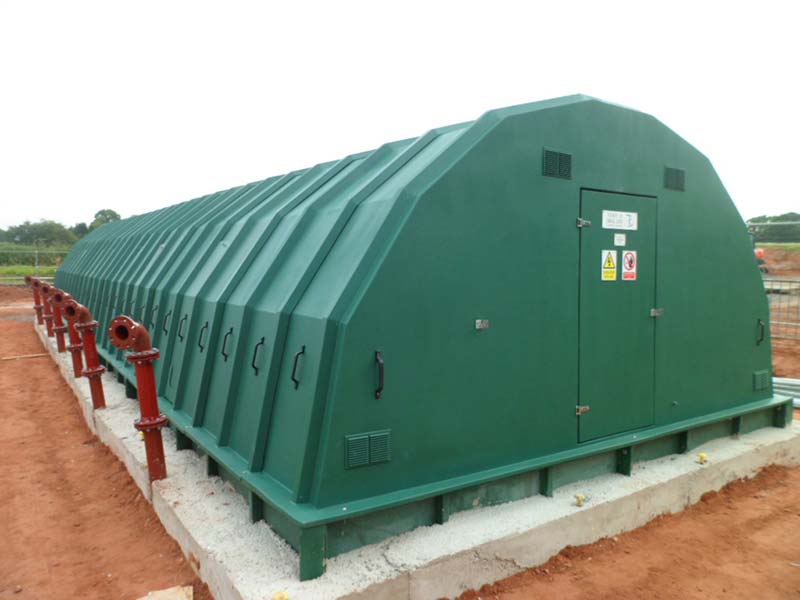 The Tuke & Bell RoBeC consists of a G.R.P. tank which is separated into a number of different treatment zones. In the Primary Settlement Zone settles gross solids into sludge, the supernatant liquor then passes forwards into the Biozone. In the Biozone, slowly rotating contactor discs treat the effluent by means of biological oxidation, the treated liquid then flows into the Final Settlement Zone. In the Final Settlement Zone any humus sludge or scum that forms as part of the natural biological process is removed by means of an automated recirculation pump system and returned to the Primary Settlement Zone for further treatment. The final effluent is then typically discharged to a reed bed or water course depending on local environmental allowances. The unit is entirely enclosed by walk-in covers; these contain any odours, guard the moving components and give a low visual impact to the plant.